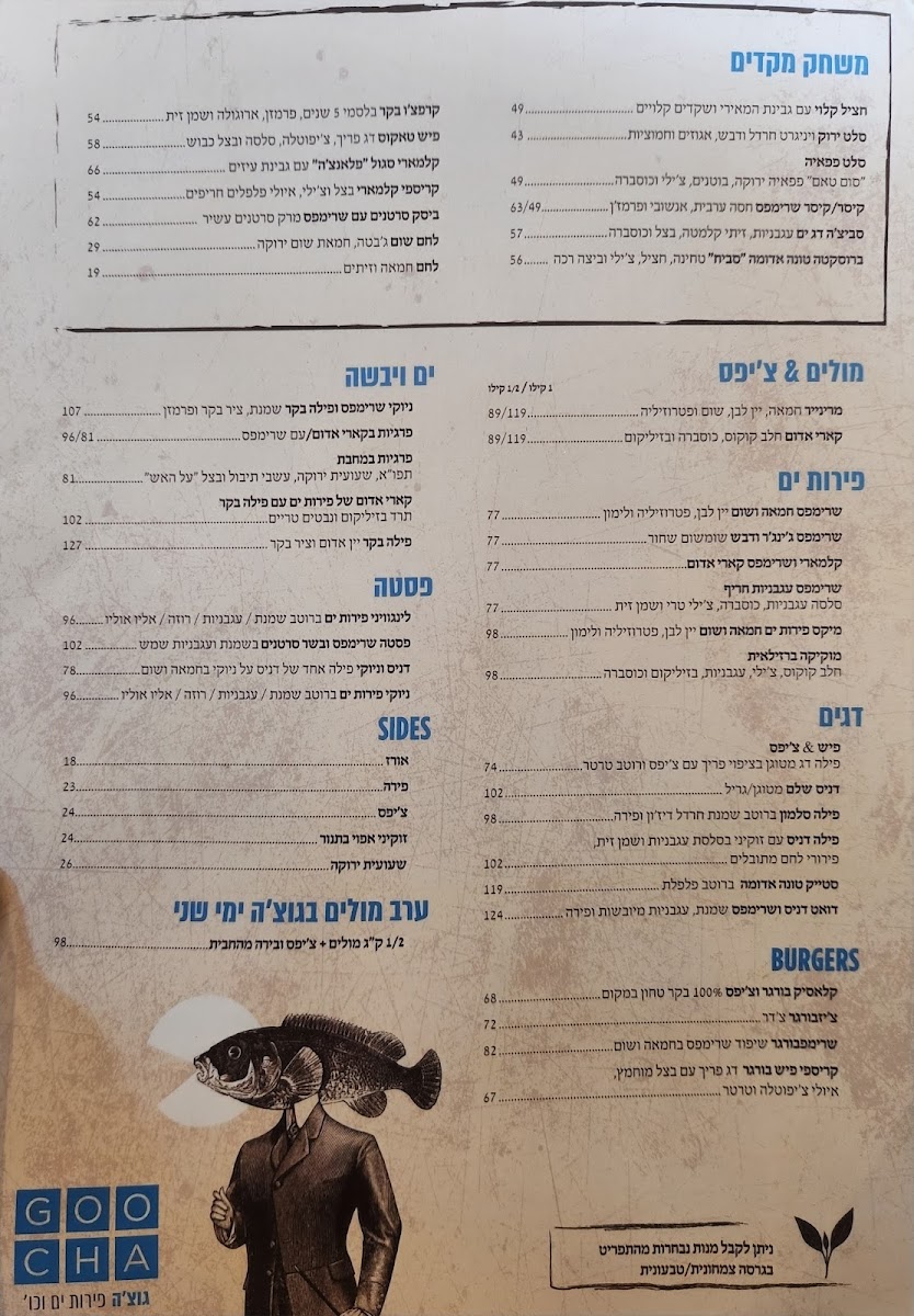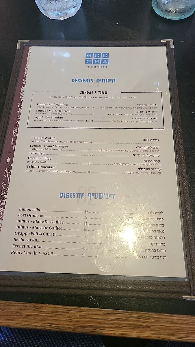 Introducing the menu of Goocha Ramat Hahayal, located at HaBarzel St 7 in Tel Aviv-Yafo, offers a delightful journey through fresh seafood and Mediterranean flavors. Renowned for its signature fish dishes, the culinary team emphasizes presentation and quality, making each plate visually appealing and easy to digest.